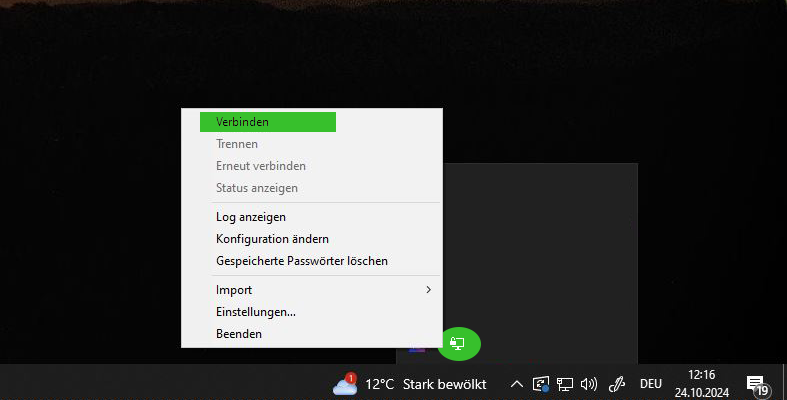 In der rechten unteren Ecke der Symbolleiste Ihres Computers sehen Sie nun das Symbol für die OpenVPN GUI. Klicken Sie mit der rechten Maustaste auf das Symbol und wählen Sie „Verbinden“. Im folgenden Bild werden alle Schritte grün hinterlegt dargestellt.